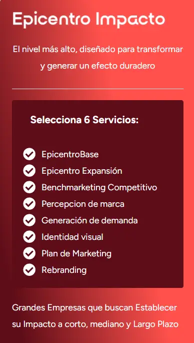 garellanof@outlook.com septiembre 5, 2025 No hay comentarios Epicentro Impacto $ 1,890.00 Incluye IGV El nivel más alto, diseñado para transformar y generar un efecto duradero Epicentro Impacto quantity AGREGAR Category: Uncategorized Description Description Selecciona 6 Servicios: 1.- EpicentroBase 2.- Epicentro Expansión 3.- Benchmarketing Competitivo 4.- Percepcion de marca 5.- Generación de demanda 6.- Identidad visual 7.- Plan de Marketing 8.- Rebranding Related products Epicentro Expansion $ 890.00 Incluye IGV AGREGAR Auditoria Completa $ 500.00 Incluye IGV AGREGAR Epicentro Base $ 690.00 Incluye IGV AGREGAR
